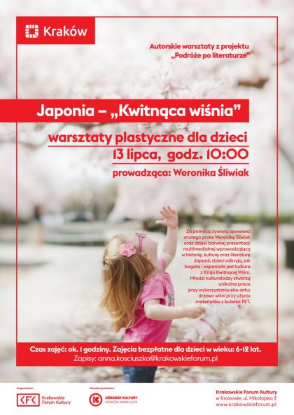 Autorskie warsztaty z projektu „Podróże po literaturze”. Za pomocą żywiołu opowieści snutego przez Weronikę Śliwiak oraz dzięki barwnej prezentacji multimedialnej wprowadzającą w historię, kulturę oraz literaturę Japonii, dzieci odkryją, jak bogata i wspaniała jest kultura z Kraju Kwitnącej Wiśni. Wiedza nabyta w części wykładowej oraz ciekawość egzotyki zostanie ugruntowana w części twórczej zajęć, podczas której młodzi kulturolodzy stworzą unikalne prace przy wykorzystaniu eko-artu.