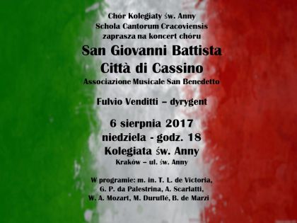 W programie m. in. T. L. de Victoria, G. P. da Palestrina, A. Scarlatti, W. A. Mozart, M. Duruflé, B. de Marzi