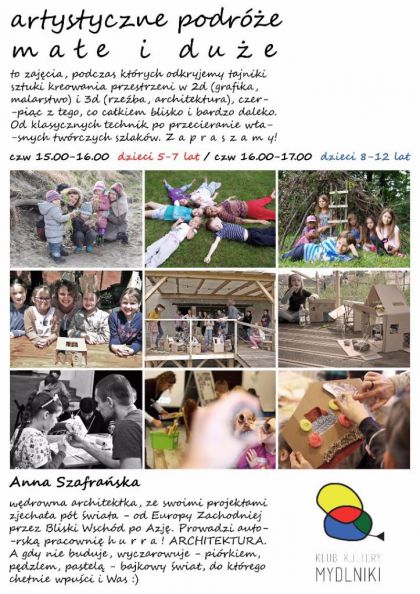 Artystyczne podróże małe i duże - zajęcia, podczas których odkryjemy sztukę kreowania przestrzeni. Zapoznamy się nie tylko z grafiką i malarstwem ale także poznamy tajniki rzeźby i architektury.