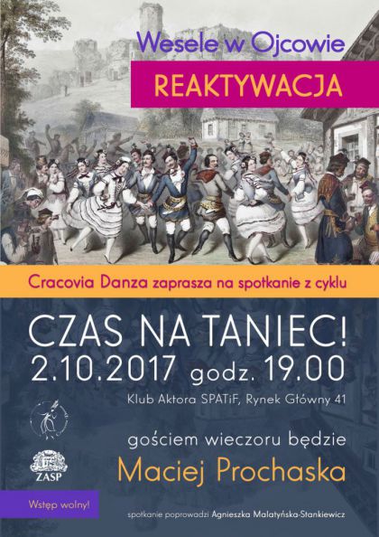 Balet Cracovia Danza w lipcu tego roku dokonał rejestracji zrekonstruowanej partytury pierwszego polskiego baletu narodowego Wesele w Ojcowie. Płytę nagrał zespół instrumentów dawnych The Violin Consort pod kierunkiem Zbigniewa Pilcha, zaś rekonstrukcji dzieła dokonał Maciej Prochaska, muzykolog z Instytutu Kolberga w Poznaniu. I właśnie temu przedsięwzięciu będzie poświęcony kolejny, a pierwszy w tym sezonie artystycznym odcinek spotkania CZAS NA TANIEC!, cyklu Baletu Cracovia Danza. Gościem spotkania zatytułowanego Wesele w Ojcowie reaktywacja, które odbędzie się w poniedziałek, 2 października, o godz. 19, w Klubie Aktora SPATiF (Rynek Główny 41) będzie Maciej Prochaska. Zdradzi on nie tylko tajemnice odtwarzania partytury, ale także wskaże źródła bez których rekonstrukcja nie byłaby możliwa. Spotkanie, którego współorganizatorem jest Odział ZASP w Krakowie, poprowadzi Agnieszka Malatyńska-Stankiewicz.