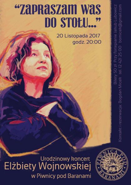 20 listopada o godzinie 20:00 w PIWNICY pod BARANAMI, po dłuższej przerwie "Zaprasza Was do stołu" ELŻBIETA WOJNOWSKA. Podczas tego urodzinowego koncertu będziecie mogli usłyszeć zarówno największe przeboje artystki jak również wybrane songi BRECHTA, przy fortepianie zasiądzie Jakub Lubowicz.