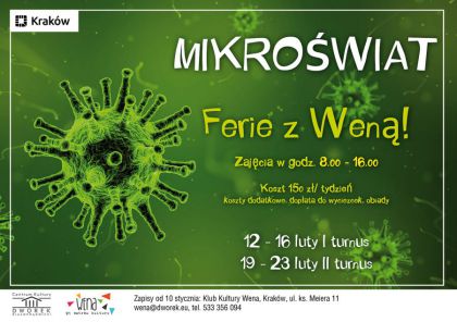 Trwają zapisy na warsztaty kulturalne w Wenie. Temat przewodni to Mikroświat. Czy wirek to mały wir? Co niesamowitego potrafi niesporczak? Czy pleśń może być pożyteczna? A czy pająki są tak straszne jak się wydaje? Zapraszamy na dwa tygodnie pełne wrażeń! Dwie niezapomniane wycieczki i ciekawe warsztaty oraz spotkania. Na pewno nikt nie będzie się z nami nudził! Szczegółowy program na naszej stronie wena.dworek.eu! Termin: 12-16 lutego (zostały dwa miejsca) i 19-23 lutego (zostało 6 miejsc). Godziny: 8:00 do 16:00 Wiek uczestników: 6-12 lat Koszt: 150zł/tydzień. Koszty dodatkowe: możliwość wykupienia obiadów, dopłata do wycieczek.