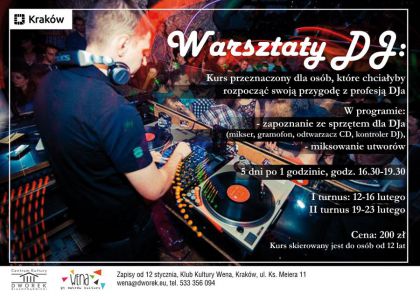 Uwaga!! Unikatowe warsztaty DJ w naszym Klubie. Zostały dwa z sześciu miejsc dla osób od 12 rż.! Zajęcia poprowadzi Marcin Postawa, profesjonalny DJ. W programie m.in. zapoznanie ze sprzętem (np. mikser, gramofon, kontroler DJ), miksowanie utworów, podstawy i sekrety pracy DJ itd. Zajęcia odbywać się będą w trakcie Ferii i każdy z uczestników będzie miał zajęcia przez 1godz. przez pięć kolejnych dni (12-16.02), godziny do wyboru: 17:30 i 18:30. Koszt udziału 200zł (płatne tylko za całość, nie ma możliwości wykupienia pojedynczych zajęć).