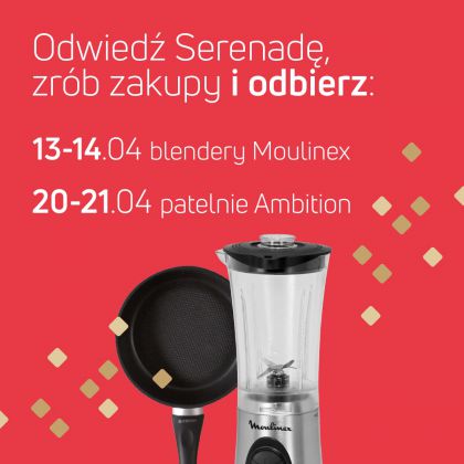 Już 13 i 14 kwietnia robiąc zakupy w Centrum Serenada o równowartości 500 zł, można otrzymać blender firmy Moulinex. Aby otrzymać nagrodę, wystarczy okazać paragony w punkcie odbioru. Paragony można ze sobą łączyć, lecz ich liczba nie może być większa niż trzy.