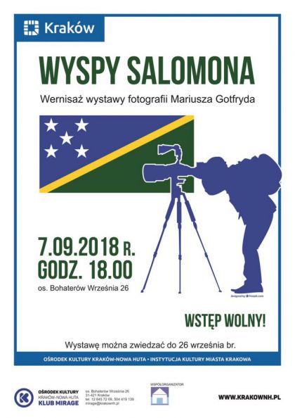 Galeria M plus w Klubie Mirage Ośrodka Kultury Kraków-Nowa Huta (os. Bohaterów Września 26) zaprasza 7 września o godz. 18.00 na wernisaż fotografii Mariusza Gotfryda. Fotografie Wysp Salomona są kolejnym wspomnieniem z jego podróży. Mariusz Gotfryd to autor książek podróżniczych oraz publikacji popularno–naukowych, geograf i miłośnik samotnych podróży po odległych zakątkach świata, rzadko odwiedzanych przez Europejczyków. Klub Mirage prezentował już fotografie z jego podróży po Indiach, Borneo, Malezji, Singapurze oraz Stanach Zjednoczonych. Wernisaż uświetni koncert gitarowy Jakuba Zieliny. Wystawę można oglądać do 25 września w godzinach otwarcia Klubu.