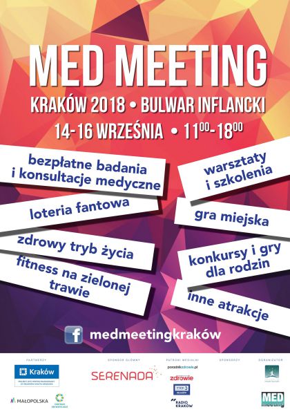 Med Meeting Kraków 2018 to trzydniowe spotkania plenerowe, które skupiają się wokół zagadnień medycyny, profilaktyki zdrowia, edukacji prozdrowotnej i zdrowego trybu życia. Mieszkańcy Krakowa, którzy wezmą w nim udział będą mieli okazję spędzić wartościowy czas w atmosferze gier, zabaw i konkursów, a także dowiedzą się jak dbać o zdrowie swoje i najbliższych. Co jeszcze czeka uczestników wydarzenia? Bezpłatne badania i konsultacje medyczne, loteria fantowa, fitness na zielonej trawie, warsztaty i szkolenia, gra miejska, a także konkursy i gry dla rodzin oraz mnóstwo innych atrakcji.