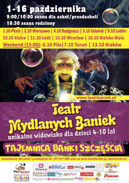 Przygotujcie się więc do prawdziwej mydlanej przygody! Będziemy rozwiązywać bańkowe zagadki, wspierać Mydlaneczkę i Bąbelka swoimi oklaskami, walczyć ze złośliwym Bulbulasem i wspólnie zmieniać stworzone przez niego dziwadła w kolorowe bańki radości. A więc wyruszajmy na poszukiwanie szczęścia! Otworzy się przed Wami świat prawdziwych cudów i baśni, które artyści tworzyć będą na magicznej scenie Bańkolandii!