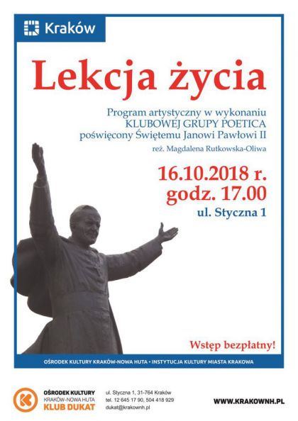 Klub Dukat Ośrodka Kultury Kraków-Nowa Huta (ul. Styczna 1) zaprasza 16 października o godz. 17.00 na Program Papieski w wykonaniu Klubowej Grupy Poetica. Przypadająca w tym roku 40 rocznica wyboru kardynała Karola Wojtyły na papieża stanowi okazję do przypomnienia życia i misji Jana Pawła II. Artystycznej interpretacji treści papieskiego nauczania podejmie się Klubowa Grupa Poetica. Dopełnienie występu stanowi multimedialna prezentacja, przybliżająca życiorys i twórczość Karola Wojtyły. Reżyserem przedstawienia jest Magdalena Rutkowska-Oliwa.