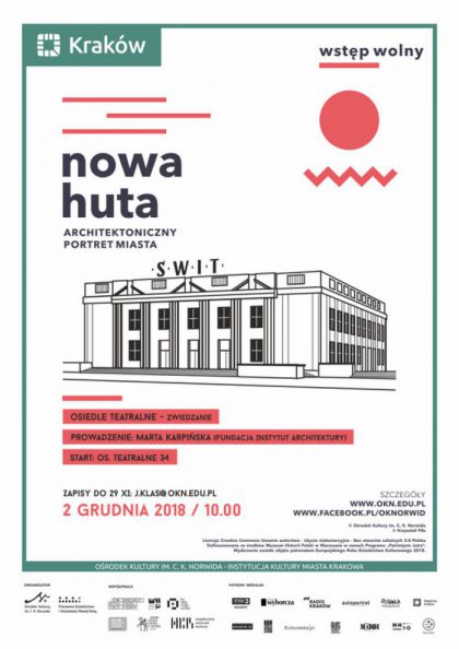 Zwiedzanie poświęcone Teatrowi Ludowemu, Szkole Tysiąclatce i dawnemu Kinu Świt w ramach projektu Nowa Huta – architektoniczny portret miasta oraz wydarzenia „Sztuka do rzeczy – design w Krakowie”. Wydarzenie towarzyszące: Element Urban Talks 2018. Prowadzenie: Marta Karpińska (Fundacja Instytut Architektury). Zapisy do 29 XI: j.klas@okn.edu.pl. Wstęp wolny.