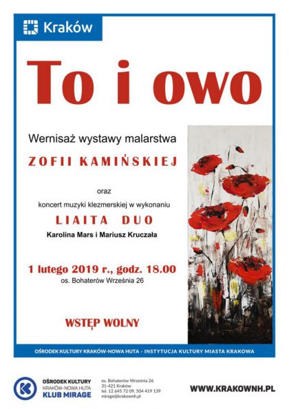 Klub Mirage Ośrodka Kultury Kraków-Nowa Huta (os. Bohaterów Września 26) zaprasza 1 lutego o godz. 18.00 na wernisaż wystawy malarstwa Zofii Kamińskiej. Spod pędzla malarki wychodzą kwiaty, pejzaże, a ostatnio również malarskie formy abstrakcyjne. Całość ujęta jest w wysmakowanej i przemyślanej kolorystyce. Talent i duży zmysł obserwacji pozwalają artystce sięgać po najtrudniejsze tematy, ze swobodą i radością tworzenia przenosić je na płótno i papier. Wernisaż uświetni koncert muzyki klezmerskiej w wykonaniu LIAITA DUO w składzie Karolina Mars i Mariusz Kruczała.