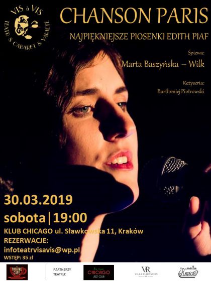 W wyjątkowym programie „CHANSON PARIS” - najpiękniejsze piosenki Edith Piaf, francuskie szlagiery oraz przeboje Ewy Demarczyk, a także wiersze Jacquesa Preverta i Haliny Poświatowskiej - zaśpiewa dla Państwa Marta Baszyńska - Wilk – aktorka scen muzycznych i wokalistka.