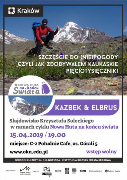 „Często po wyprawie nasuwa się refleksja, jak to jest z tym szczęściem do pogody podczas wyprawy. Ile trzeba szczęścia aby choć przez chwilę zobaczyć ze szczytu skrawek otaczającego świata. Podczas slajdowiska opowiem o swojej wyprawie na Kazbek i Elbrus, o pogodzie, kawie, utracie wzroku partnerki i o pomylonej drodze, którą dzień wcześniej przechodziłem.”