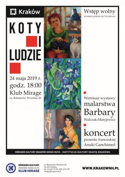 Galeria M Plus w Klubie Mirage Ośrodka Kultury Kraków-Nowa Huta (os. Bohaterów Września 26) zaprasza 24.05 o godz. 18.00 na wernisaż wystawy malarstwa Barbary Walczak-Matyjewicz. Autorka prac swoją przygodę z malarstwem rozpoczęła w pracowni Domu Kultury Pod Baranami, prowadzonej przez prof. Ludwika Pindela. Studia i praca zawodowa sprawiły, że zarzuciła malarstwo na około 20 lat, jednak potrzeba tworzenia dała o sobie znać ponownie. Barbara Walczak-Matyjewicz jest współzałożycielką grupy malarskiej Pasja, którą obecnie prowadzi krakowski artysta malarz Mariusz Dudka.