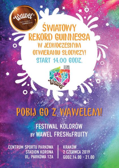 Marka Wawel ma wyjątkową propozycję dla wszystkich fanów słodkości z Krakowa i nie tylko! Już 2 czerwca, podczas Festiwalu Kolorów by Wawel Fresh & Fruity, w Centrum Sportu Parkowa, przy ulicy Parkowej 12A, od godziny 14:00, marka razem z podopiecznymi Fundacji „Wawel z Rodziną”, a także z innymi uczestnikami Festiwalu podejmie próbę zdobycia niezwykłego rekordu Guinnessa – w jednoczesnym otwieraniu słodyczy. Słodkości Wawel, które będą otwierane, by pobić ten rekord to pyszne owocowe galaretki Fresh & Fruity, których z pewnością nie zabraknie na tym niezwykłym wydarzeniu.