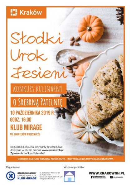 Osoby chętne, by podzielić się swoim najlepszym przepisem na ciasto w jesiennym klimacie i wziąć udział w konkursie proszone są o zgłaszanie uczestnictwa w Klubie Mirage Ośrodka Kultury Kraków-Nowa Huta (os. Bohaterów Września 26) do 3 października. Szczegóły konkursu w Regulaminie dostępnym w Klubie oraz na stronie internetowej www.krakownh.pl.
