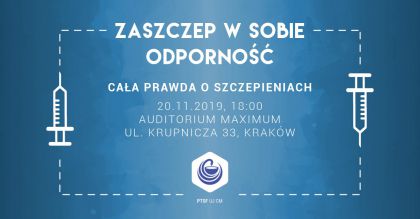 Z pomocą przychodzi konferencja “Zaszczep w sobie odporność - cała prawda o szczepieniach” organizowana przez Polskie Towarzystwo Studentów Farmacji UJ CM. Odbędzie się ona 20 listopada 2019 roku w Auditorium Maximum UJ przy ul. Krupniczej 33 w Krakowie. Patronat Honorowy nad wydarzeniem objął prof. dr hab. Jacek Sapa - Dziekan Wydziału Farmaceutycznego UJ CM, kierownik Zakładu Wstępnych Badań Farmakologicznych Wydziału Farmaceutycznego UJ CM.