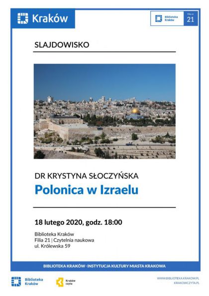 O polskim śladach na terenie państwa izraelskiego opowie rozmiłowana w tym kraju dr Krystyna Słoczyńska – emerytowany adiunkt AGH, z zamiłowania podróżniczka, wielokrotna organizatorka znanych w całej Polsce wypraw do Izraela. Prezentacji zdjęć z wypraw do Izraela będzie towarzyszył wykład podróżniczki.