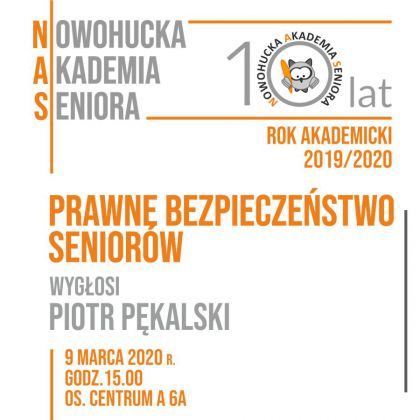 Nowohucka Akademia Seniora (os. Centrum A 6a) zaprasza 9 marca o godz. 15.00 na wykład „Prawne bezpieczeństwo seniorów”. W zawiłościach polskiego prawa gubią się czasem nawet obeznani z nim na co dzień prawnicy, a co dopiero seniorzy. Osoby starsze często nie zdają sobie sprawy, jakie zagrożenia i kruczki czają się na nich zarówno ze strony pospolitych przestępców i oszustów jak również działających całkowicie legalnie, ale dążących za wszelką cenę do zwiększenia zysku firm. Mimo wysiłków wielu instytucji, mimo promowania wiedzy na temat potencjalnych zagrożeń, nieustannie słyszymy o nowych metodach oszukiwania i okradania seniorów. Temat bezpieczeństwa prawnego seniorów jest wciąż aktualny, dlatego poświęcony będzie mu kolejny wykład Nowohuckiej Akademii Seniora. Oszustwa i kradzieże metodą na wnuczka, na policjanta, na sprzedawcę. Drobny druczek w umowach – czy i w jakich przypadkach można odstąpić od umowy oraz jak i kiedy negocjować jej warunki. Fałszywe wezwania z kancelarii prawnych dotyczące zaległego rachunku za telefon lub prąd. To tylko kilka z zagadnień, które zostaną poruszone podczas wykładu, który wygłosi Piotr Pękalski – doktorant w Katedrze Prawa administracyjnego UJ, prawnik w Małopolskim Urzędzie Wojewódzkim w Krakowie oraz Samorządowym Kolegium Odwoławczym w Krakowie.