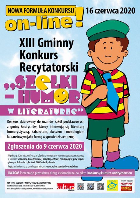 W czasach pandemii koronawirusa nie można organizować konkursów stacjonarnie. Centrum Kultury i Wypoczynku w Andrychowie podjęło decyzję, by ten konkurs, cyklicznie odbywający się w naszej gminie, przeprowadzić w wersji on-line. Serdecznie zapraszamy dzieci i młodzież do udziału w XIII edycji Gminnego Konkursu Recytatorskiego „SZELKI – HUMOR W LITERATURZE” w nowej formie! ❗❗❗Zgłoszenia przyjmowane są do 9 czerwca 2020 r.
