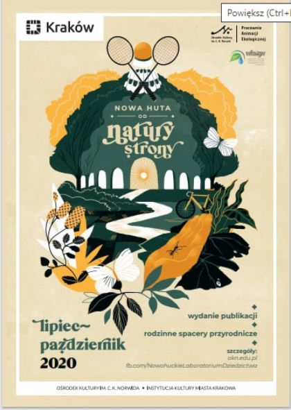 Nowa Huta od NATURY strony - projekt z zakresu edukacji ekologicznej w obszarze dziedzictwa przyrodniczego najbardziej zielonej części Krakowa, organizowany przez Pracownię Animacji Ekologicznej działającą w ramach Nowohuckiego Laboratorium Dziedzictwa Ośrodka Kultury im. C. K. Norwida. Zakłada organizację weekendowych rodzinnych spacerów poznawczo-badawczych organizowanych dla mieszkańców Nowej Huty i Krakowa. W okresie od lipca do października 2020 r. odbędą się 4 spacery tematyczne po Łąkach Nowohuckich oraz 7 wypraw szlakami przyrodniczymi dzielnicy, podczas których prezentowane będą wszystkie formy zieleni miejskiej (użytki ekologiczne, nieużytki, zieleń parkowa i forteczna, ogródki działkowe, zieleń podwórek i osiedli - w tym pomniki przyrody i parki kieszonkowe, zieleń ciągów rzecznych, lasy miejskie). Na zakończenie projektu powstanie publikacja elektroniczna, która opisywać będzie miejsce każdej z wypraw wraz z krótką charakterystyką innych podobnych w Nowej Hucie. Dofinansowano ze środków Wojewódzkiego Funduszu Ochrony Środowiska i Gospodarki Wodnej w Krakowie.