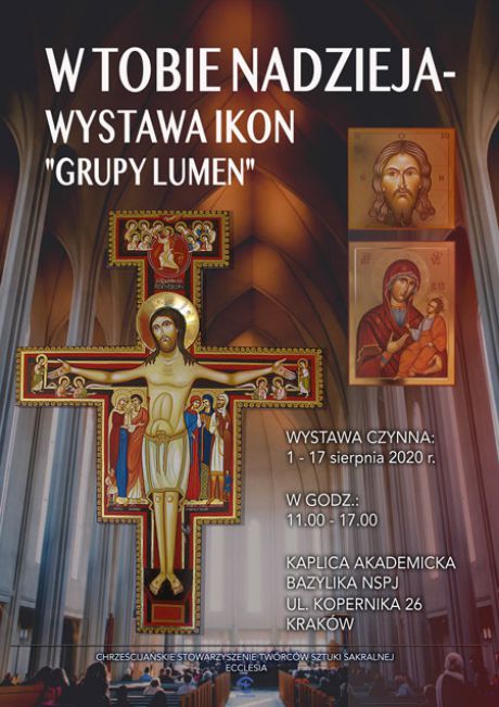 Zapraszamy do odwiedzenia wystawy ikon prezentowanych przez członków „Grupy Lumen” p.t.: „W TOBIE NADZIEJA” Wystawa prezentowana jest w pomieszczeniach Kaplicy Akademickiej przy Bazylice NSPJ, ul. Kopernika 26, Krakowie w dniach 1-17 sierpnia 2020 r., w godz. 11.00- 17.00.