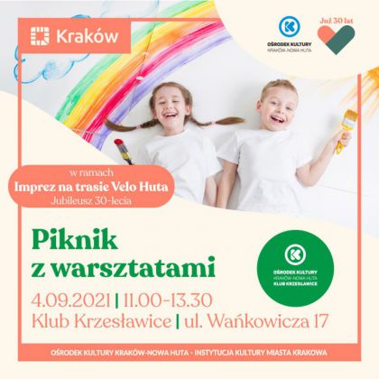 Klub Krzesławice Ośrodka Kultury Kraków-Nowa Huta (ul. M. Wańkowicza 17) zaprasza na warsztatowy piknik na terenie zielonym przy budynku Klubu. Z okazji obchodzonego w tym roku jubileuszu 30-lecia działalności Ośrodka Kultury Kraków-Nowa Huta w sobotę 4 września w godz. 11.00-13.30 Instruktorki Klubu zaplanowały warsztaty plastyczne, podczas których powstaną wielkoformatowe prace związane z Ośrodkiem Kultury i przyświecającym mu hasłem „Tworzymy to miejsce razem”. Wszystkich, którzy przemierzać będą w tym dniu rowerowy szlak Velo Huta, zachęcamy, aby zrobić przystanek przy Klubie, odpocząć i skorzystać z przygotowanych atrakcji.