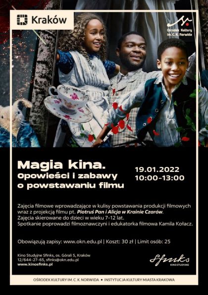 Wszystkie dzieci w wieku 7-12 lat zapraszamy na zajęcia filmowe wraz z projekcją filmu pt. „Piotruś Pan i Alicja w Krainie Czarów” (2020, reż. Brenda Chapman). Zajęcia rozpoczną się o godzinie 10:00 w dużej sali kina Sfinks i potrwają do 13:00. Podczas spotkania najmłodsi widzowie będą mieli okazję dowiedzieć się jakie są kulisy powstawania produkcji filmowych oraz poznać podstawowe zagadnienia związane z kinematografią. Młodzi kinomani wspólnie sformułują definicję słowa „film”, poznają etapy realizacji filmu, zastanowią się także jakie są zawody filmowe i kto pracuje na planie zdjęciowym. Części warsztatowej spotkania towarzyszyć będzie prezentacja multimedialna oraz gry i zabawy. Następnie rozpocznie się seans filmu familijnego pt. „Piotruś Pan i Alicja w Krainie Czarów”. Po projekcji dzieci wymienią się wrażeniami oraz spostrzeżeniami z obejrzanego filmu.