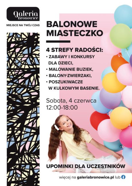 W sobotę 4 czerwca na najmłodszych klientów Galerii Bronowice czekać będzie mnóstwo atrakcji przygotowanych pod hasłem „Balonowego Miasteczka”. Przygotowano strefy radości, a w nich m.in. zabawy i konkursy, malowanie buziek w wybrane, fantazyjne wzory czy wspólne tworzenie balonowych zwierzątek. Będzie również poszukiwanie balonów w wielkim, wypełnionym kulkami basenie. Każda z tych aktywności dostępna będzie w wybranej, jednej z 4 stref. Na początku zabawy najmłodsi otrzymają specjalny dyplom, w którym - za udział w poszczególnych atrakcjach, zbierać będą pieczątki. Na terenie Galerii na poziomie +1 pojawi się także tajemnicza, ostatnia strefa, którą trzeba będzie znaleźć, by odebrać piątą pieczątką. Dzieci, które zbiorą komplet pieczątek, otrzymają dodatkowy upominek. Zabawa trwać będzie w godzinach 12:00-18:00 - wszystkie atrakcje są bezpłatne.