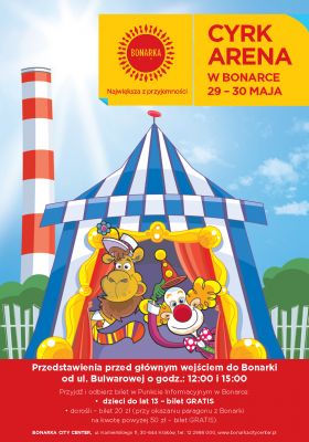 W sobotę i niedzielę, 29 i 30 maja, miłośnicy widowiskowej akrobacji, poskramiania dzikich zwierząt, występów klaunów i innych sztuk cyrkowych, będą mogli zobaczyć występy Cyrku „Arena”. Spektakle odbędą się w sobotę i niedzielę o godz. 12:00 i 15:00, przed głównym wejściem do Bonarki (od strony ul. Bulwarowej). Przed każdym przedstawieniem chętni będą mieli możliwość przejażdżki na kucyku i… na wielbłądzie!