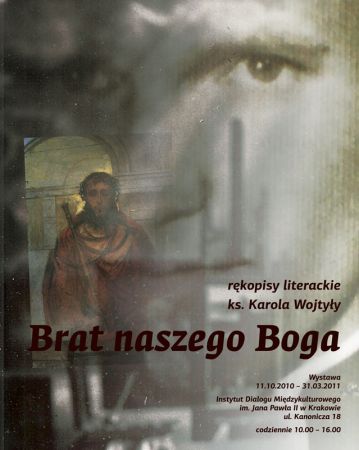 Na wystawie prezentowane będą niepokazywane dotąd: brulion dramatu Karola Wojtyły Brat naszego Boga, ze zbiorów Archiwum Kurii Metropolitalnej w Krakowie i rękopis ze zbiorów Archiwum Krakowskiej Kapituły Katedralnej, fotografie z czasów, gdy był kapłanem i biskupem diecezji krakowskiej (ze zbiorów Archiwum Kurii Metropolitalnej w Krakowie i Archiwum Artystycznego i Biblioteki Teatru im. Juliusza Słowackiego w Krakowie). Wystawa jest twórczą odpowiedzią na pytanie o transformacje Karola Wojtyły i jego stosunku do sztuki. „W 1944 roku Karol Wojtyła przedstawił pierwszą wersję Brata naszego Boga ks. Józefowi Matlakowi, proboszczowi parafii św. Stanisława Kostki na Dębnikach w Krakowie, proszą o wstępną ocenę. Młody Karol pracował wtedy jeszcze w kamieniołomie w Solvayu i angażował się w prace Teatru Rapsodycznego. Jednocześnie uczestniczył już w studiach teologicznych podziemnego seminarium duchownego przygotowując się do kapłaństwa. Dramat poświęcony św. Bratu Albertowi Chmielowskiemu pojawił się cztery lata od napisania Jeremiasza (1940 r.). Nad tekstem tego utworu pracował Karol Wojtyła do 1950 roku, kiedy powstała jego ostateczna wersja opublikowana po raz pierwszy w Poezjach i dramatach w 1979 roku. Pierwsza wersja z 1944 roku nosi wyraźnie charakter teatru rapsodycznego: osoby nie mają własnych imion, dialogi są bardzo surowe, brak akcji. We wstępie do ostatecznej wersji, napisanej po powrocie z Rzymu między 1948-1950, ks. Karola Wojtyła zadeklarował, iż jego dramat jest próbą przeniknięcia człowieka i dotarcia do tego, co jest niedostępne na zewnątrz. Jest bowiem przekonany, że u źródeł człowieczeństwa tkwi pierwiastek pozahistoryczny, który pragnie ukazać w swoim dramacie, w mniejszym stopniu dbając o szczegóły.” (ks. Jan Machniak, Bóg i człowiek w poezjach i dramatach Karola Wojtyły – Jana Pawła II. Kraków, 2007).