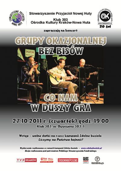 Stowarzyszenie Przyjaciół Nowej Huty i Klub 303 Ośrodka Kultury Kraków-Nowa Huta (os. Dywizjonu 303 1) zapraszają na koncert Co nam w duszy gra…, który odbędzie się 27 października (czwartek) 2011 r. o godz. 19.00.