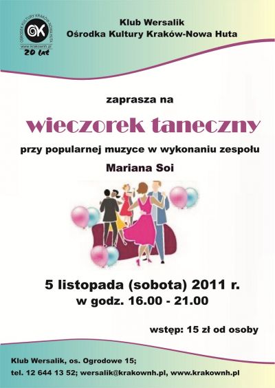 Klub Wersalik Ośrodka Kultury Kraków-Nowa Huta (os. Ogrodowe 15) zaprasza na imprezę taneczną dla dorosłych i seniorów przy popularnej muzyce na żywo w wykonaniu zespołu Mariana Soi.