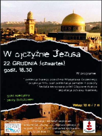 W czwartek, 22 grudnia o godz. 18:30 zapraszamy do Centrum Kultury "Ruczaj" na spotkanie Klubu Podróżnika. Temat najbliższego spotkania to "W ojczyźnie Jezusa", a poprowadzi je Władysław Grodecki, który zaprezentuje filmy, zdjęcia i pamiątki ze swojej podróży do Izraela. Gościem specjalnym będzie Jerzy Brzozowski. Dodatkowo, wszyscy uczestnicy będą mogli spróbować tradycyjnej, izraelskiej potrawy oraz herbaty serwowanej przez Czajownię Kraków.