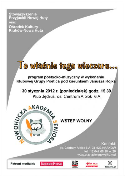 Stowarzyszenie Przyjaciół Nowej Huty i Ośrodek Kultury Kraków-Nowa Huta zapraszają, w ramach Nowohuckiej Akademii Seniora, na refleksyjny program poetycko – muzyczny, mówiący o treściach zawartych w przesłaniu bożonarodzeniowym, połączony ze wspólnym kolędowaniem. Wystąpi Klubowa Grupa Poetica z Klubu Dukat.