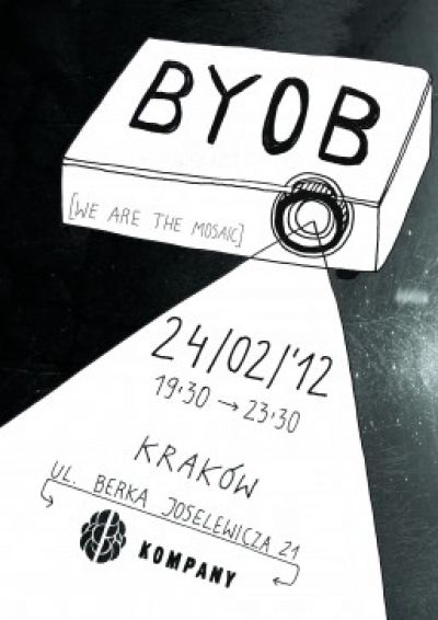 24 lutego 2012 r. zapraszamy na BYOB (Bring Your Own Beamer), czyli na pokaz prac mutlimedialnych, fotografii, animacji i wizualizacji – stworzonych przez Was. Pierwsza krakowska edycja imprezy odbędzie się pod hasłem: „We are the mosaic”. Swoją twórczość w przestrzeni Kompany będzie mógł zaprezentować każdy, kto przyniesie ze sobą komputer oraz projektor. Kuratorami imprezy są Jarek Tokarski oraz Maria Regucka. O atrakcje muzyczne wieczoru zadba Justice Beamer (uk bass / future garage).