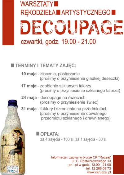 Centrum Kultury "Ruczaj" zaprasza na zajęcia z techniki decoupage w ramach warsztatów rękodzieła artystycznego. Zajęcia odbywają się w czwartki o godz. 19:00-21:00.