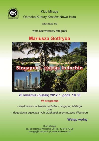 Klub Mirage Ośrodka Kultury Kraków-Nowa Huta (os. Bohaterów Września 26) zaprasza na otwarcie wystawy fotografii Mariusza Gotfryda Singapur - tygrys Indochin.