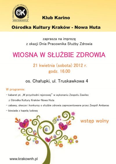 Klub Karino Ośrodka Kultury Kraków-Nowa Huta (ul. Truskawkowa 4) zaprasza mieszkańców Chałupek na imprezę z okazji Dnia Pracownika Służby Zdrowia, która odbędzie się 21 kwietnia 2012 r. (sobota) o godz. 16.00.