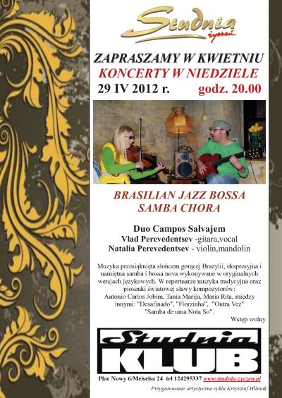Muzyka przesiąknięta słońcem gorącej Brazylii, ekspresyjna i namiętna samba i bossa nova wykonywane w oryginalnych wersjach językowych. W repertuarze muzyka : Antonio Carlos Jobim, Tania Marija, Maria Rita,