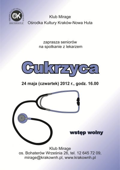 Klub Mirage Ośrodka Kultury Kraków-Nowa Huta (os. Bohaterów Września 26) zaprasza na spotkanie dla cukrzyków lub osób nią zagrożonych.