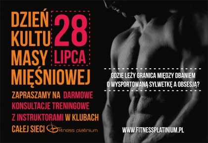 Już po raz kolejny sieć Fitness Platinium oferuje wyjątkowy dzień w swoich klubach! Już 28 lipca, przeprowadzamy zupełnie darmowe konsultacje treningowe z naszymi trenerami personalnymi z okazji Światowego Dnia Kultu Masy Mięśniowej! Konsultacje świetnie sprawdzą się zarówno u rozpoczynających trening jak i tych, którzy już trenują i chcą sprawdzić lub poprawić jego efektywność.