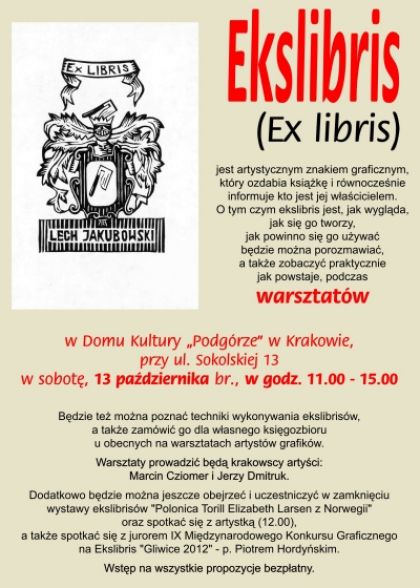 Już w najbliższą sobotę ( 13.10) Dom Kultury Podgórze zaprasza wszystkich miłośników ekslibrisów na warsztaty.