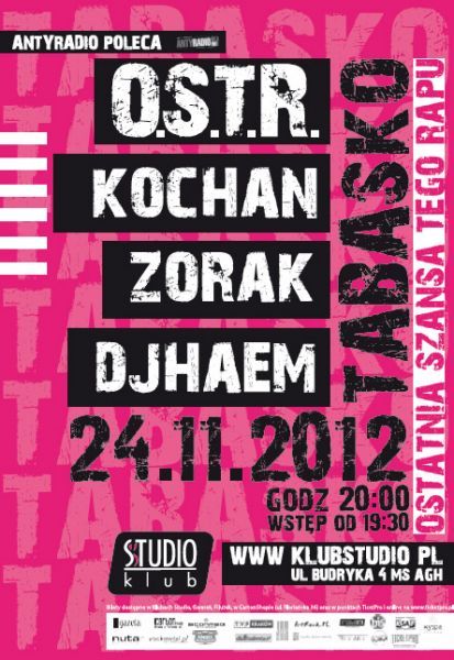 Sobota 24 listopada przyniesie koncert hip-hopowy w Klubie Studio. Na scenie zaprezentuje się projekt Tabasko tworzony wspólnymi siłami O.S.T.R. – jednego z najbardziej uznanych polskich raperów – oraz Kochana i DJ Haema. Formacja powstała w 2002 roku w Łodzi, zaś w roku 2011 jej skład wzbogacił beatboxer Zorak.
