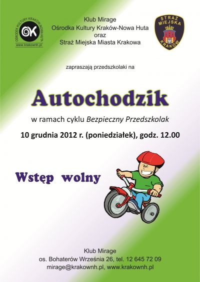 Klub Mirage Ośrodka Kultury Kraków-Nowa Huta (os. Bohaterów Września 26) zaprasza 10 grudnia 2012 r. o godz. 11.30 na zajęcia z zakresu bezpieczeństwa i unikania zagrożeń prowadzone przez Jacka Gronowskiego ze Straży Miejskiej.