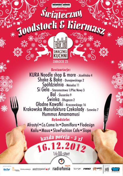 Już 16.12.2012 druga edycja, tym razem wyjątkowa, bo świąteczna. Oprócz kolejnych wystawców kulinarnych (znanych już i nieznanych) pojawią się też osoby i firmy związane z szeroko pojętym rękodziełem i modą offową. Postanowiliśmy rozszerzyć Foodstock o świąteczny kiermasz. Zapraszamy Wszystkich tych, którzy chcą smacznie, zdrowo i ciekawie podjeść oraz kupić coś oryginalnego i niespotykanego dla siebie i swoich najbliższych.