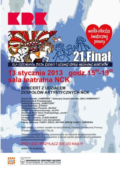Po raz kolejny Nowohuckie Centrum Kultury włącza się w Finał Wielkiej Orkiestry Świątecznej Pomocy. W tym roku Orkiestra gra pod hasłem „Dla ratowania życia dzieci i godnej opieki medycznej seniorów”. Młodzież ze sztabu wolontaryjnego, pod kierownictwem Jerzego Kujawskiego „Szpinaka”, będzie zbierała pieniądze na wsparcie terapii noworodka i niemowlaka, a także na wyposażenie w sprzęt szpitali geriatrycznych i zakładów opiekuńczo-leczniczych. Tradycyjnie na sali teatralnej (w godz. 15.00-19.00) odbędzie się koncert, na którym zaprezentują się zespoły artystyczne działające w NCK-u.