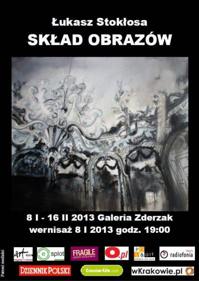 Druga indywidualna wystawa obrazów Łukasza Stokłosy wprowadzi nas ponownie w klimat noir. Razem z Autorem będziemy wędrować po opustoszałych wnętrzach europejskich pałaców zamienionych w muzea. Poczdam, Wersal, Nymphenburg... Galeria zamieni się w XVIII-wieczny skład obrazów – ścianę główną ciasno zapełnią płótna, na stołach i pulpitach można będzie oglądać fotografie, pamiątki z podróży.