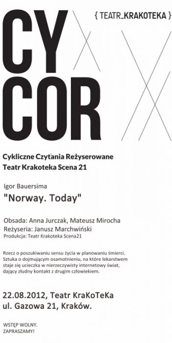 Teatr KraKoTeka Scena 21 zaprasza na kolejną odsłonę projektu Cykliczne Czytania Reżyserowane - CYCOR: Igor Bauersima "Norway. Today".
