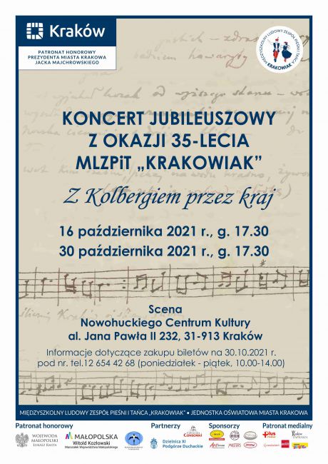 Midzyszkolny Ludowy Zesp Pieni i Taca Krakowiak wituje 35 lat dziaalnoci artystyczno-wychowawczej. Publiczno zyska spor dawk wspaniaej zabawy. Ze sceny popyn skoczne dwiki, a oczom widzw ukarz si artyci prezentujcy swj dotychczasowy dorobek. Wydarzenie, w formie widowiska muzyczno-teatralnego, prcz warstwy estetycznej, posiada take wymiar edukacyjny. Koncert, zatytuowany Z Kolbergiem przez kraj, da sposobno zapoznania si z dawnymi tradycjami i obrzdami obecnymi w wczesnych polskich chatach. Na scenie ujrzymy prawie 200 tancerzy, tryskajcych wigorem, pyncym z pasji do folkloru... A to wszystko ju 16 padziernika w Nowohuckim Centrum Kultury. Pocztek 17.30. Drugi raz taka okazja zdarzy si dwa tygodnie pniej, 30 padziernika, o tej samej porze i w tym samym miejscu.
