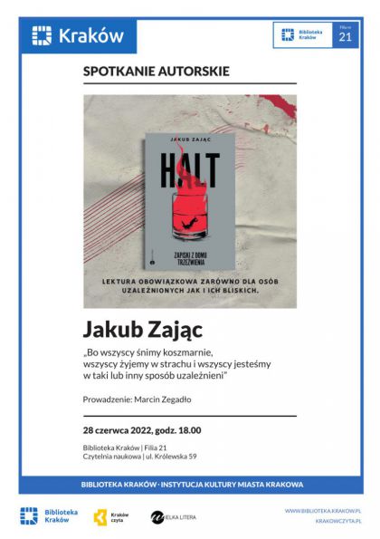 Zapraszamy na spotkanie autorskie z Jakubem Zającem. Będziemy rozmawiać o najnowszej książce HALT. Zapiski z domu trzeźwienia" (Wielka Litera). "To nie jest zwykła książka o alkoholiku, który dzieli się swoimi wspomnieniami z ośrodka odwykowego. To raczej opowieść o skatowanej duszy, udręczonym ciele i niezwykle bystrym umyśle".
